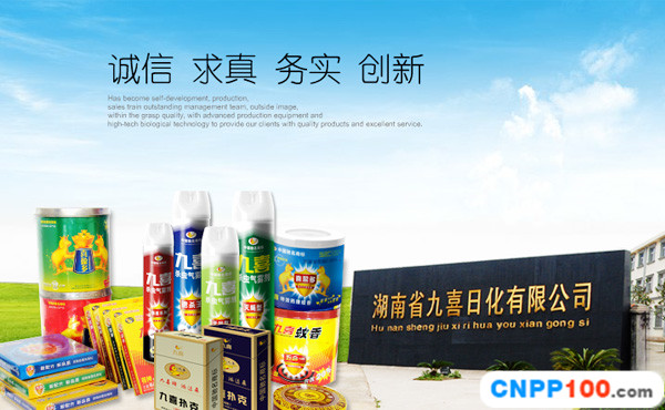 湖南省九喜日化有限公司创建于2001年,家用卫生杀虫剂的专业制造企业。现拥有200余亩的大型生产、仓储基地,配备了数十余条国内先进的家庭卫生杀虫系列用品自动化生产线,企业生产员工近千人,公司拥有注册资本1100万元,固定资产5000万元,近20000平方米的高标准、完全符合环保要求的现代化标准生产厂房,年生产能力达240万件蚊香系列产品和1500万罐气雾杀虫剂。